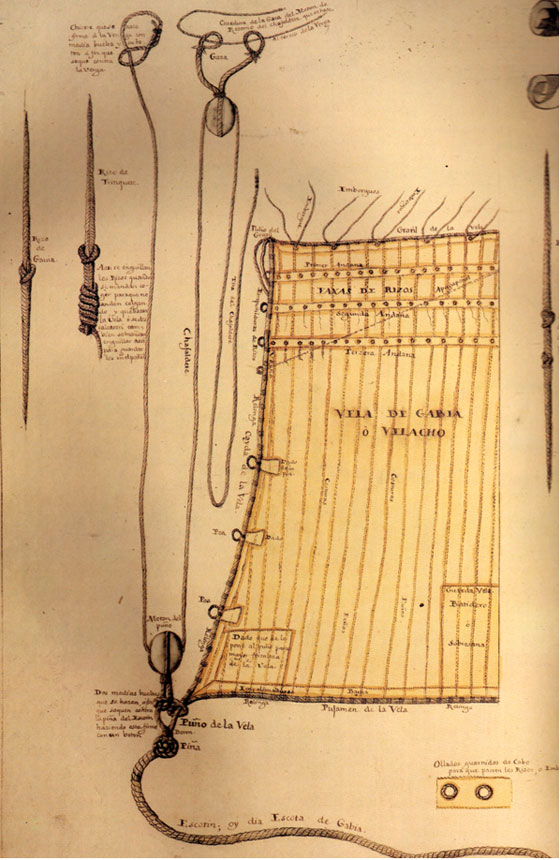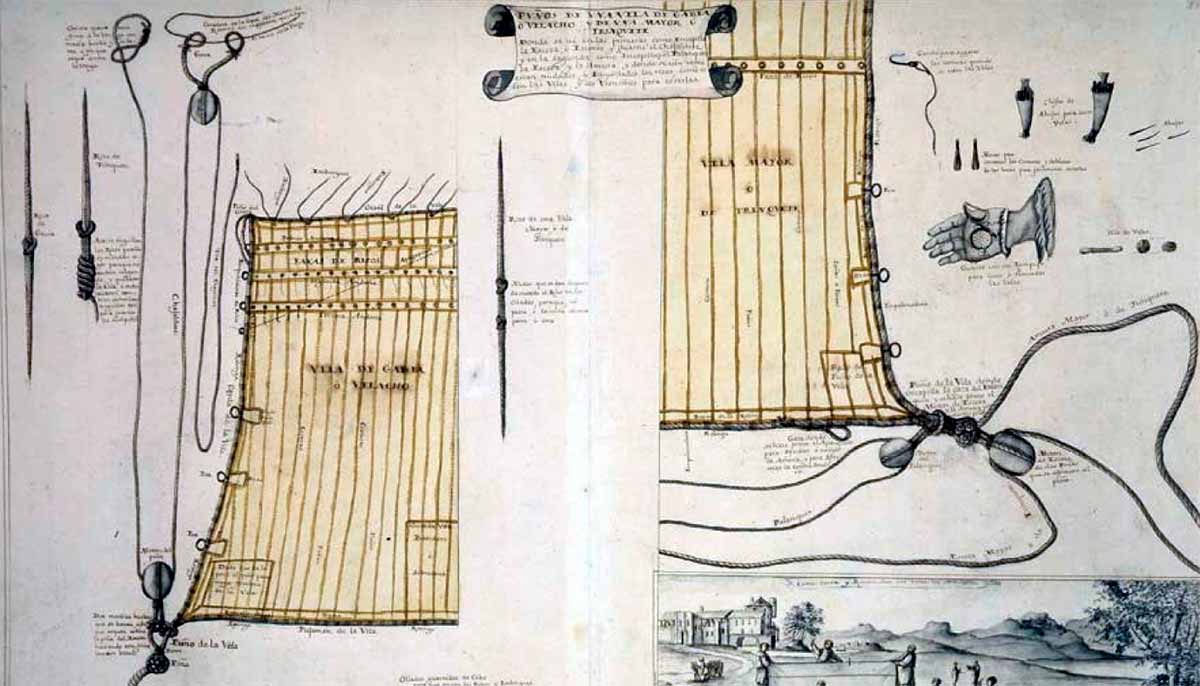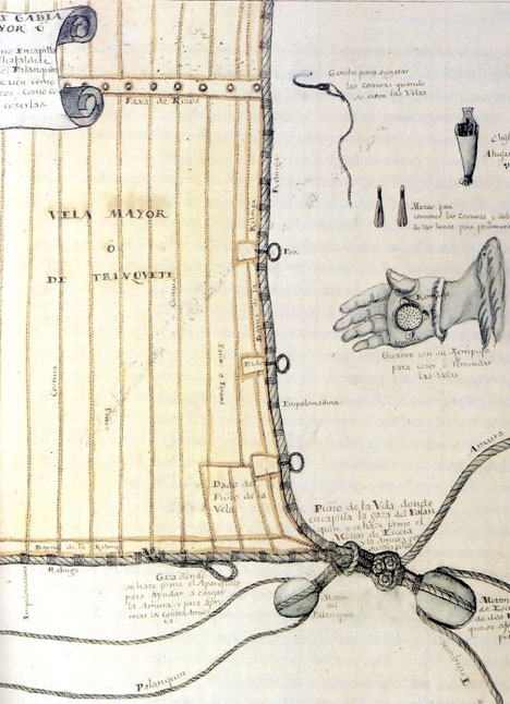 En los dibujos anteriores del diccionario del marques de La Victoria, se pueden distinguir, con lujo de detalles, cada uno de los componentes mencionados, y detalles de los puños de la vela, de los rizos y chafaldetes y palanquín. Guía inmejorable para maquetistas.