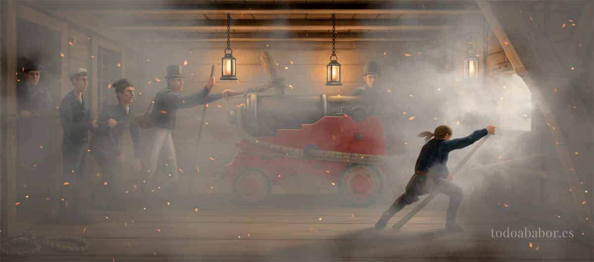 Y por si el fuego enemigo fuera poco, quedan los aplastamientos por caída de escombros, como vergas, cabos, y demás material de las arboladuras que caen a las atestadas cubiertas. Un mástil que se viene abajo en cubierta puede aplastar a una veintena de hombres en un momento y llegar del impacto a la primera batería.