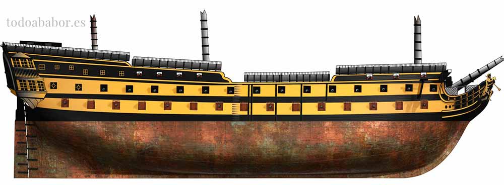 Navío de tercer orden y 74 cañones. Ilustración de Todo a babor.