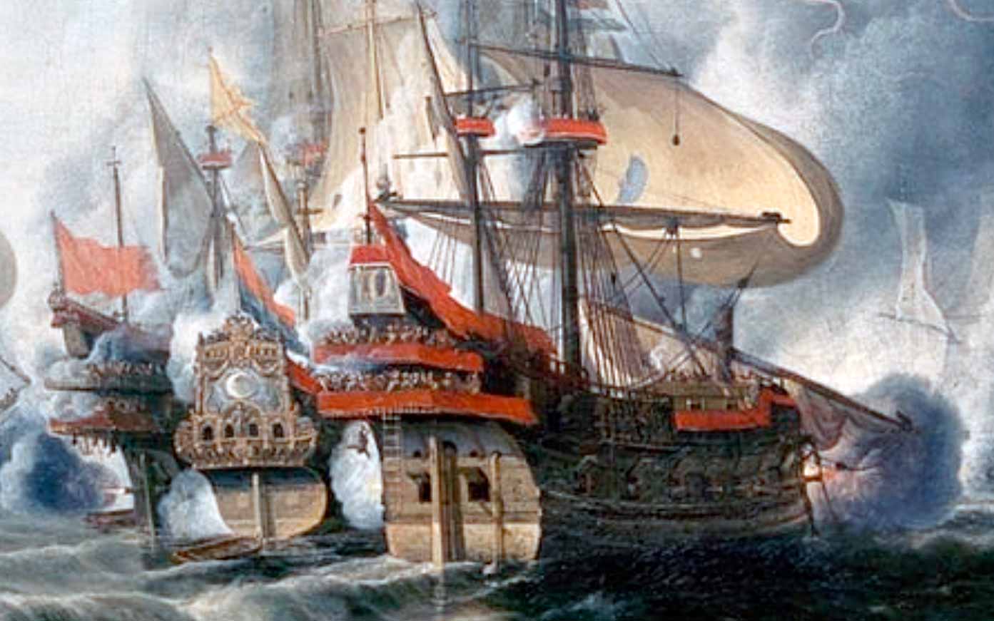 El galeón «Jesús María» acude al rescate del «Santa Ana», que está siendo combatido ferozmente por los neerlandeses. Detalle de la pintura de Simon de Vlieger. Gallery Rob Kattenburg.
