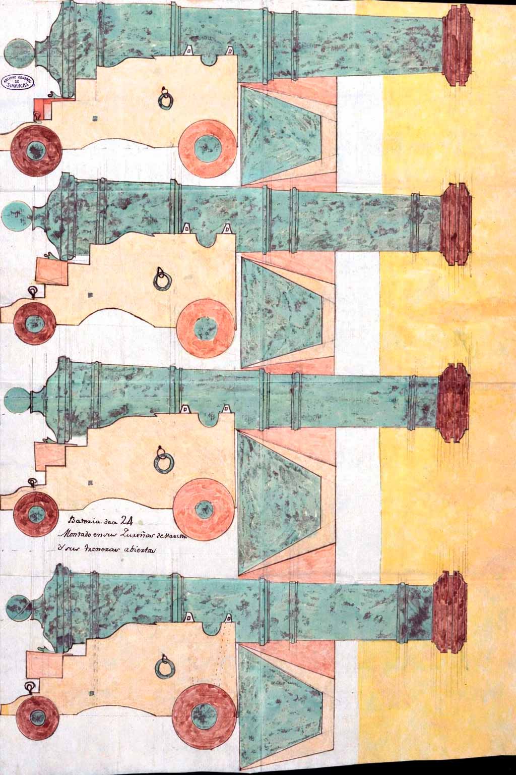 Son cuatro cañones navales y por eso lo mencionamos, ya que son virtualmente idénticos al anterior abatiportado. En esta ilustración vemos una batería de costa con cañones navales, algo bastante corriente por entonces. Las cureñas que aparecen son, como las del documento precedente, de estilo inglés, con su argolla, rebaje inferior y sin solera.