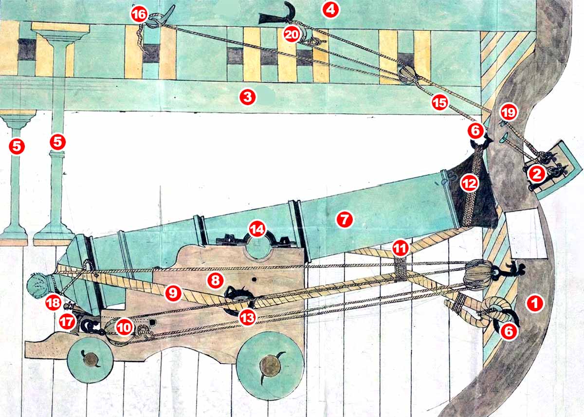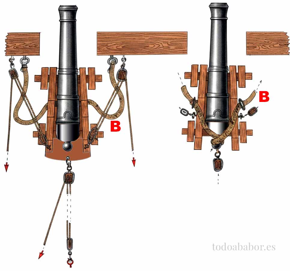 - He visto en algunas ilustraciones explicativas modernas que se colocan dos palanquines de retenida en los cañones españoles, cuando en realidad solo tenían uno. En la monumental y exquisita obra sobre el navío francés de 74 cañones de Jean Boudriot (publicada entre 1973 y 1977) se pueden comprobar todos los datos expuestos en este artículo sobre los cañones franceses.