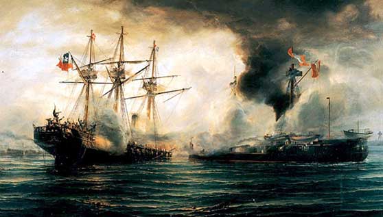 - 1866. Combate naval del 2 de mayo. El brigadier Méndez Núñez tras el bombardeo de Valparaíso se enfrenta a la marina peruana que a su vez es apoyada por las baterías costeras. Pese a que Núñez es herido y los peruanos se atribuyen la victoria tuvieron más de 200 muertos mientras que los españoles 43. Tras este enfrentamiento la Real armada considera terminada la campaña de castigo y se retira; a su regreso la Numancia se convierte en el primer buque blindado en dar la vuelta al mundo.