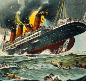 - 1915. El submarino alemán U-20 torpedea al trasatlántico Lusitania, el cual se hunde con 1.198 personas. Tales protesta provoca que Estados Unidos declarará la guerra a las potencias centrales; mientras los germanos se excusan en que el buque era inglés no americano, estaba artillado como crucero auxiliar y llevaba armamento americano de contrabando. La versión alemana explicaría porque un buque tan grande se hundiera en solo 18 minutos y al poco de recibir el impacto hubo una segunda explosión en el lado opuesto del buque; pese a todo aún no se ha podido aclarar.