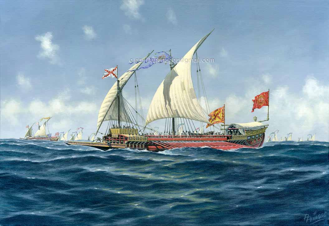 Eran naves finas, alargadas y de bajo bordo, se desplazaban impulsadas por el viento recogido en sus velas latinas, y si no lo había era la chusma la que se encargaba de marinar la nave bogando o ciando, moviendo sus decenas de remos al ritmo que marcaba el cómitre.