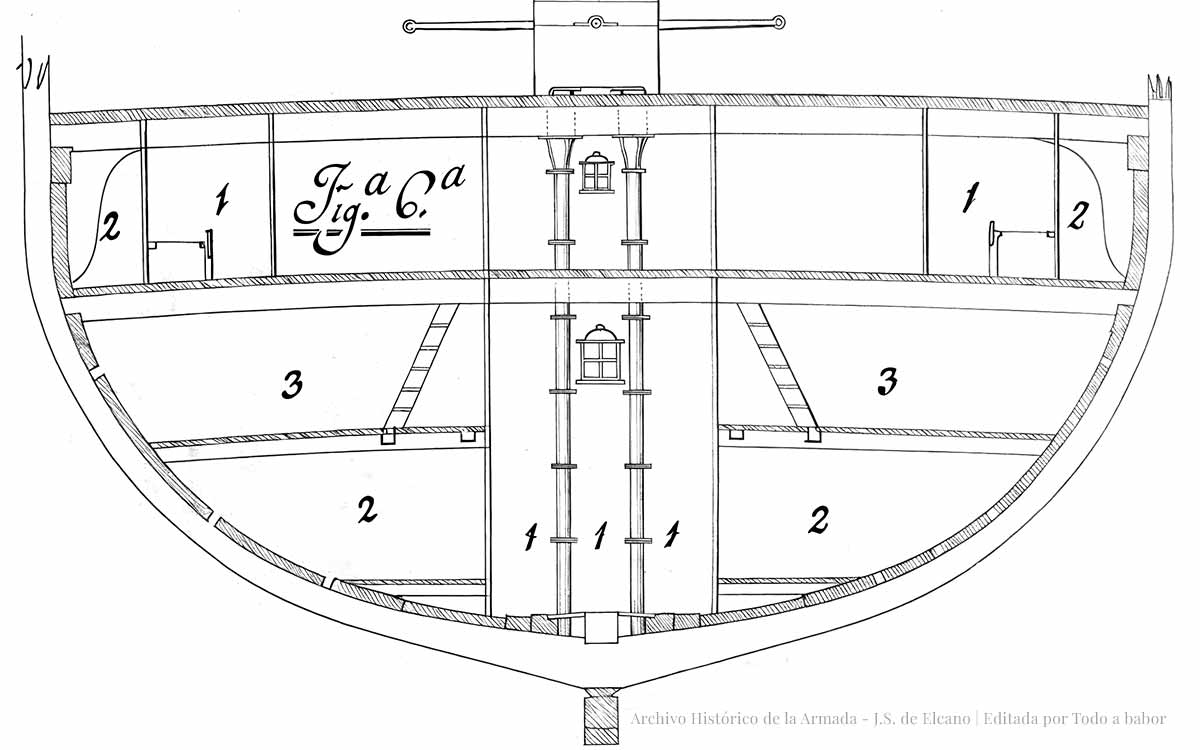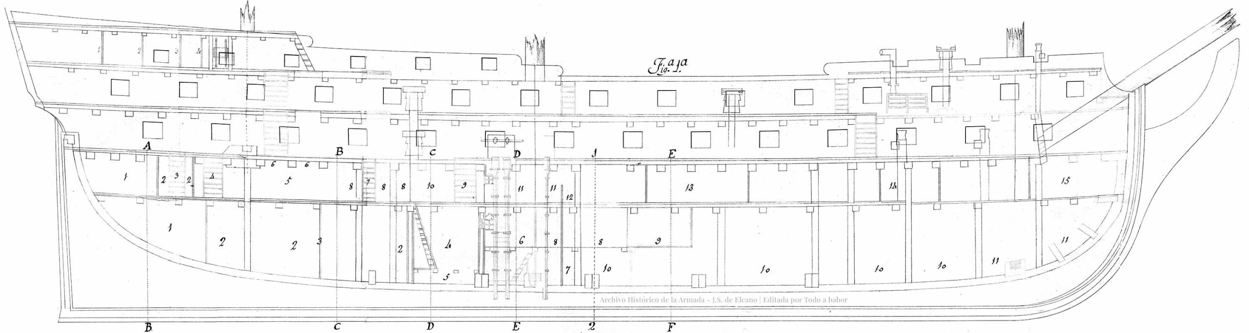 Nota: Las cubiertas de la primera y segunda batería no tienen división alguna, y la del alcázar solo tiene las nº 1 y 2 que corren de babor a estribor para la cámara y tres camarotes del comandante y dos tenientes de navío; y las nº 3 y 4 están hechas en el centro para el camarote del segundo a proa del comandante y la capilla.
