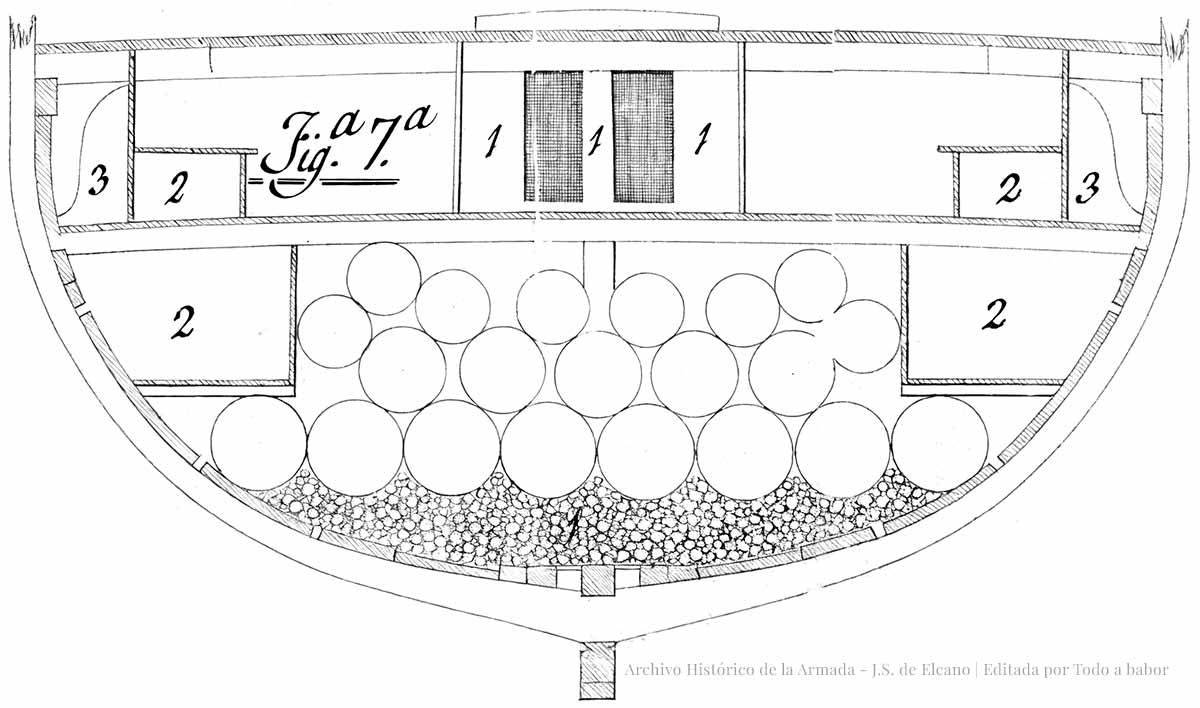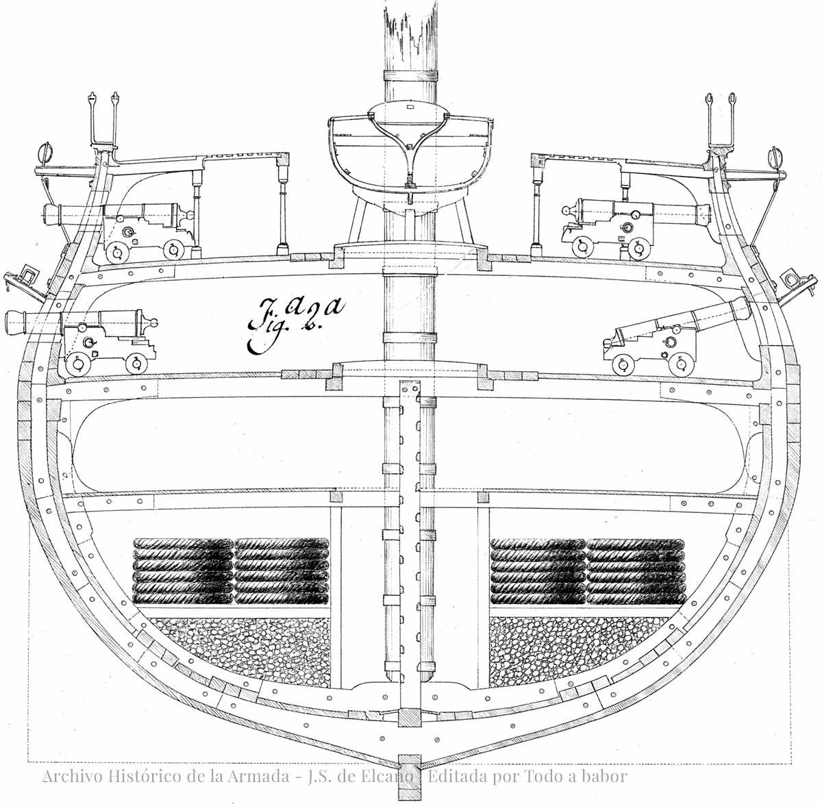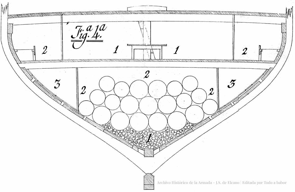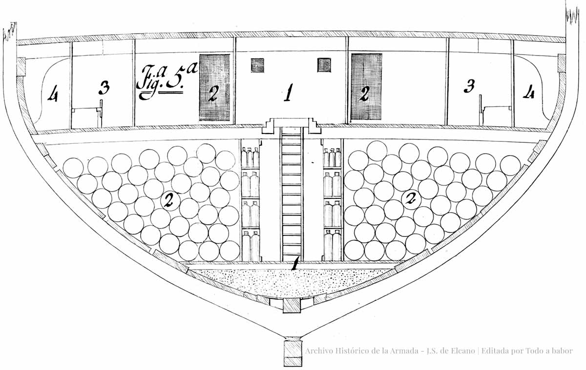 - Pañoles de pólvora en ambas bandas, encartuchador en el centro con una puerta en cada lado para entrar en dichos pañoles y estantes para los cartuchos, y la escalera de bajada desde el sollado.