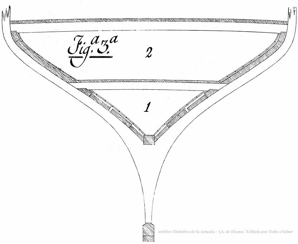- Soler2 del pañol de pólvora a 3 pies de la sobrequilla para dejar un hueco suficiente a preservar la pólvora de la humedad por medio del carbón con que se ha de llenar este hueco.