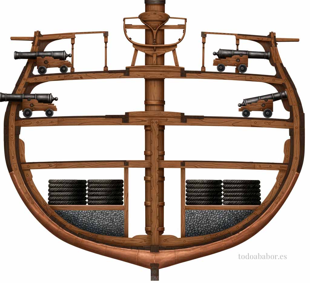 1. Pañol de pan en el extremo de popa de la despensa con un forro de tabla delgada separado del costado por medio de listones a din de preservar de la humedad y de cualquier filtración de agua.
