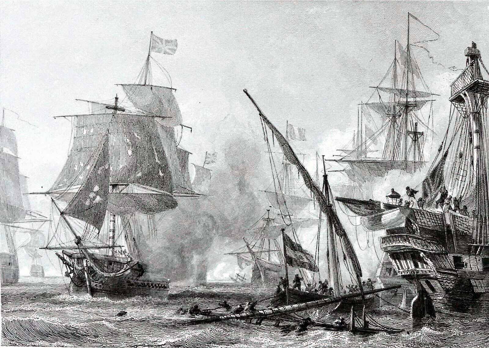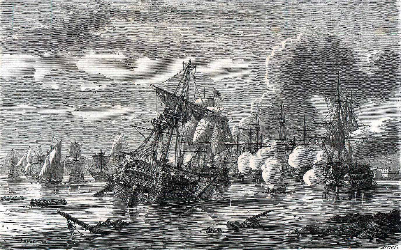 Serían las nueve de la mañana al aproximarse el primer navío inglés y romper el fuego, contestando desde las baterías de tierra, las lanchas cañoneras y los bajeles franceses. Aquel y los dos que le seguían dejaron caer sus anclas casi a toca penoles, mientras que los otros remontaban con la idea indicada (94)