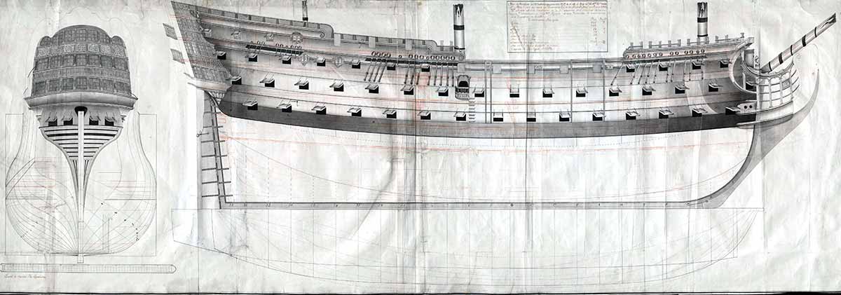 Este hermoso modelo de arsenal fue construido en La Carraca, en Cádiz, entre 1766 y 1767. Se siguieron los gálibos del ingeniero Ignacio Mullan, que había elaborado un plano para un navío de 114 cañones (en el Museo Naval de Madrid está dicho plano con la identificación PB-197). Era, por tanto, de sistema inglés y terminaría siendo nuestro emblemático Santísima Trinidad, construido en La Habana en 1769. Era parecido al británico Royal George de 100 cañones.