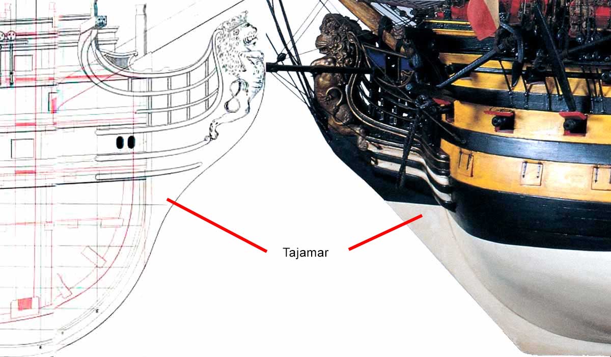 Con respecto a las mesas de guarnición del plano, podemos comprobar que la de mesana está en distinta posición que en el modelo del Museo Naval de Madrid. Puede, o no, tener una explicación. Todo depende de si se basaron en planos o en un navío que podría haber sufrido modificaciones en sus mesas de guarnición. Incluso en el modelo se ha utilizado una pequeña meseta más a popa de la mesa de mesana, detalle muy propio de la construcción del sistema “a la inglesa”.