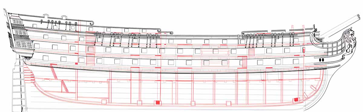 Es en la ubicación de las portas de las baterías de cañones donde existe una gran diferencia entre el modelo y el plano original.