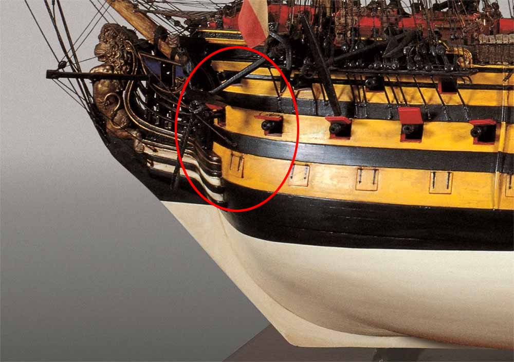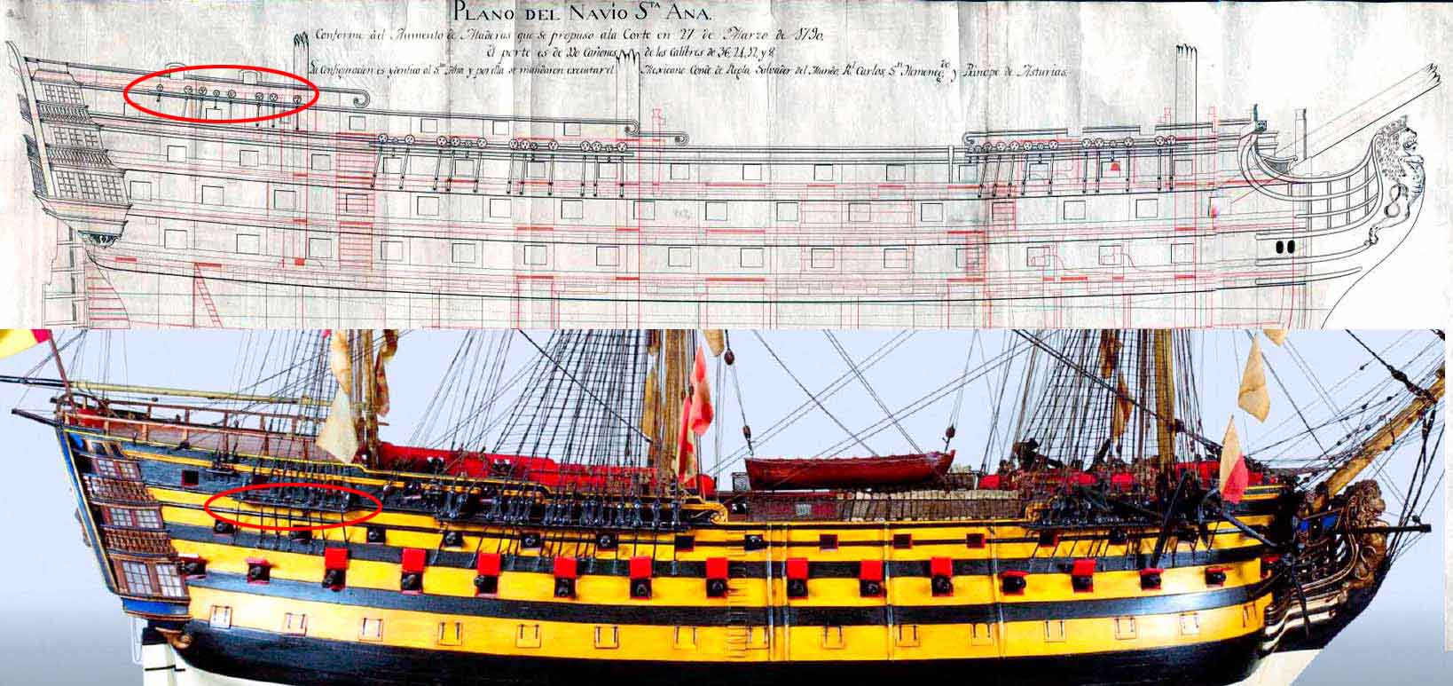 Asimismo, los escobenes (orificios por donde sale o entra el cable del ancla) del plano están situados correctamente, aproximadamente a la altura del centro de las portas de la primera batería, mientras que en el modelo su ubicación resulta incomprensible, casi a la altura de los baos de la segunda cubierta.
