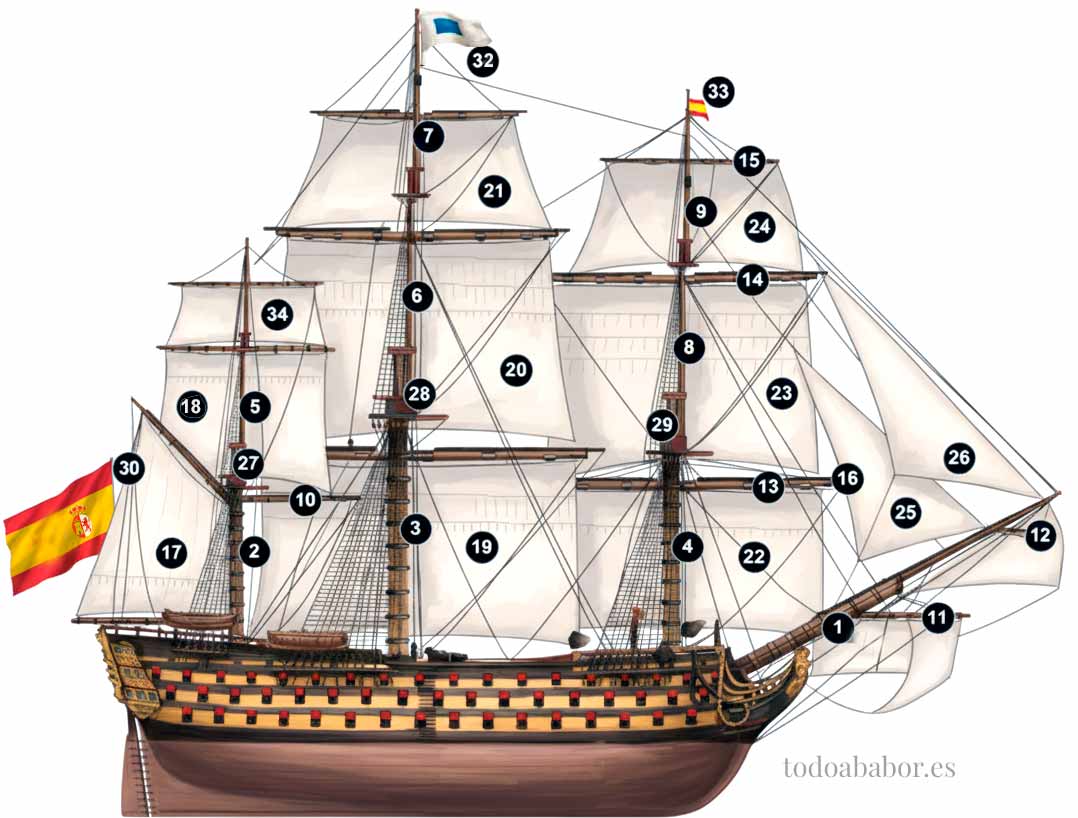Más información sobre las velas principales de un navío y los cabos que la representan.