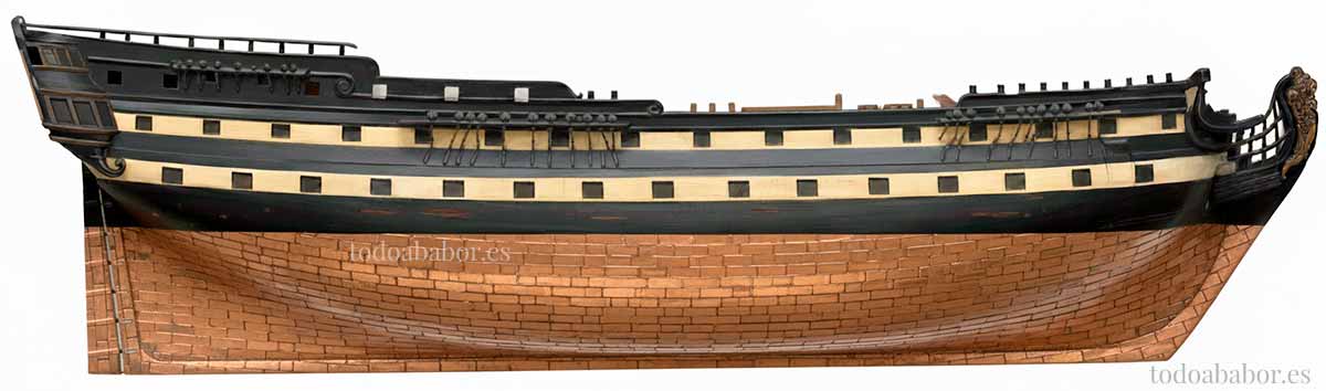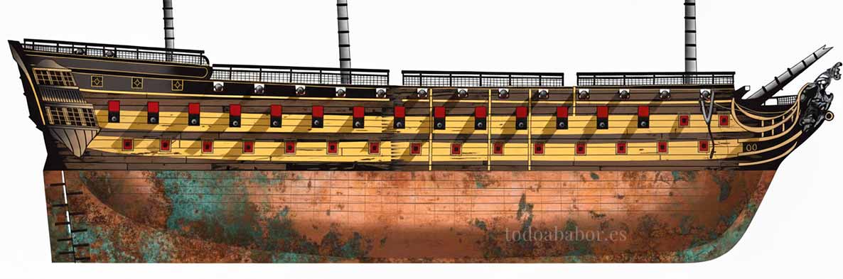 Perfil del navío Rayo remontado a tres baterías (1804). Vemos que tiene el forro de cobre muy oxidado y necesita cambiarlo. En contra de lo que se esperaba el remonte a una tercera batería no hizo más que aumentar los defectos en navegación al decano de nuestros navíos de línea. El remonte de esta nueva batería se hacía fusionando el alcázar y el castillo del navío para poder poner artillería en el antiguo pasamanos. Consiguiendo en el Rayo el aumento de 10 piezas más por banda. Ilustración de Todo a babor.