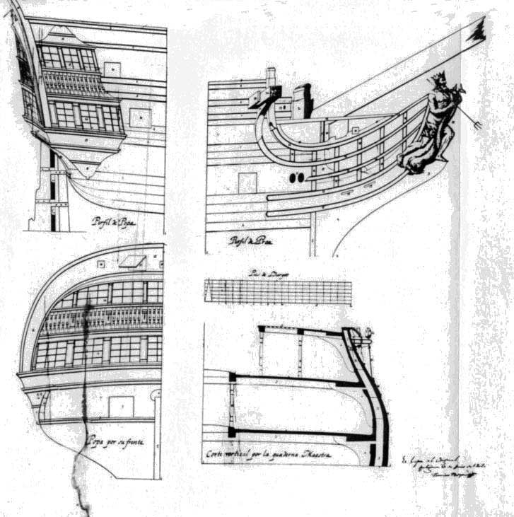 En la tercera imagen tenemos un plano con los detalles de proa y popa del Neptuno.