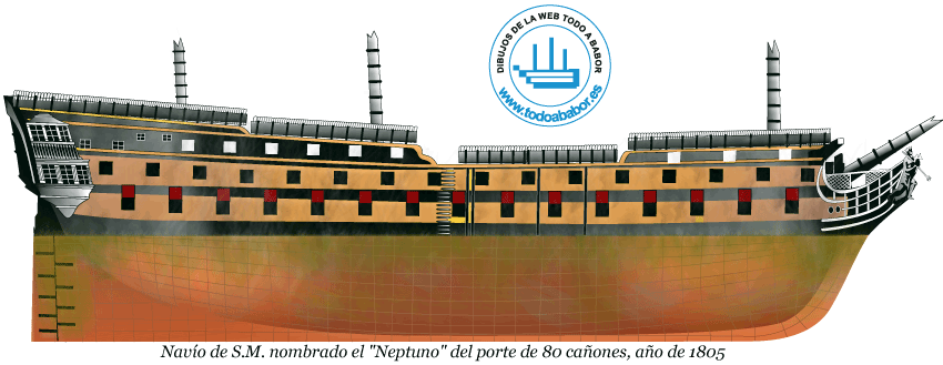 En la segunda imagen tenemos una vista de costado o en su mayor longitud en el sentido de la quilla del navío en 1805. Ilustración de Todo a Babor.