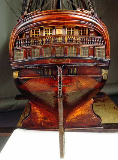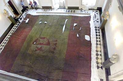 En la segunda imagen tenemos la bandera de guerra del navío "San Ildefonso" que fue capturado en Trafalgar. Tiene unas medidas enormes de 9,8 x 14,4 metros y se encuentra en proceso de restauración ya que debido al tiempo transcurrido es una tela muy delicada. Esta bandera fue colgada en la Catedral de San Paul en Londres el día del entierro de Nelson el 9 de enero de 1806. Actualmente en el Museo Nacional Maritimo.