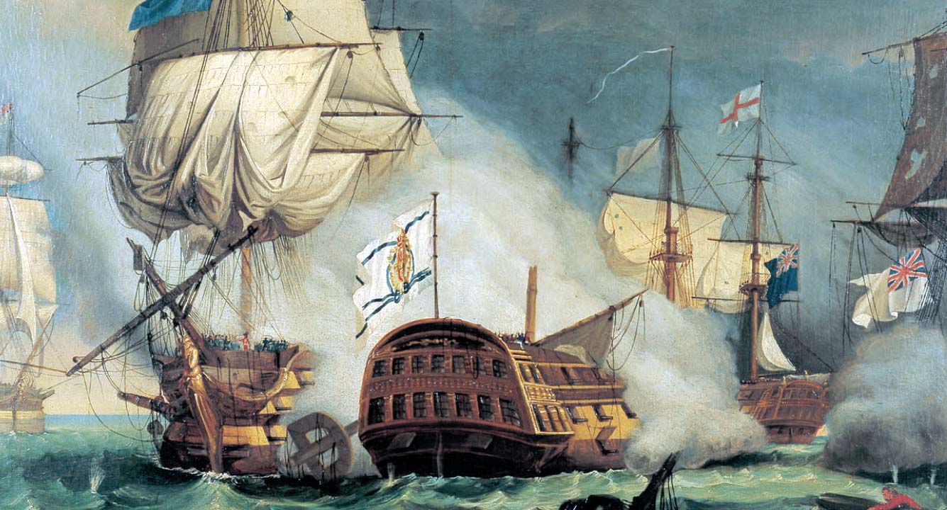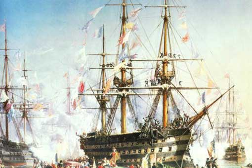 Pintura del Museo Naval de Madrid. Representa al navío español "San Hermenegildo" de 112 cañones navegando con otros buques. Este hermoso navío desapareció con el "Real Carlos" en 1801.