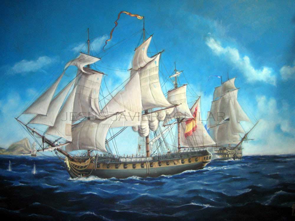 Fragata española navegando frente a Gibraltar acosada por barcos ingleses. Óleo sobre tabla.