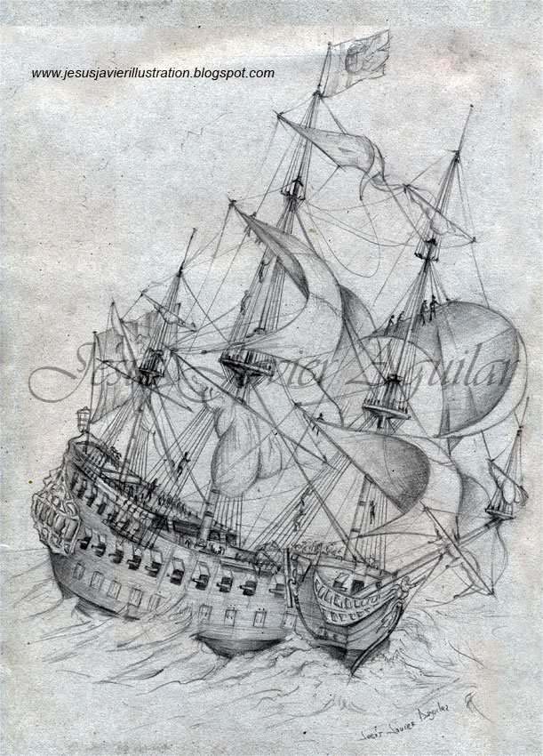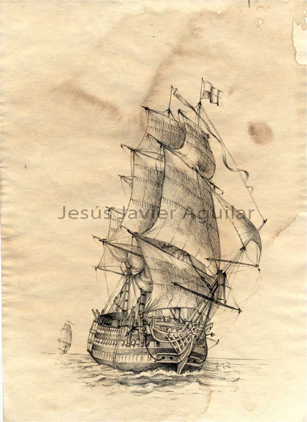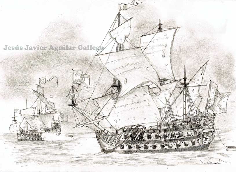 Dibujo a lápiz que representa dos navíos de línea en combate. Por su aspecto son navíos de finales del siglo XVII y principios del XVIII. En primer plano uno español y al fondo otro inglés.