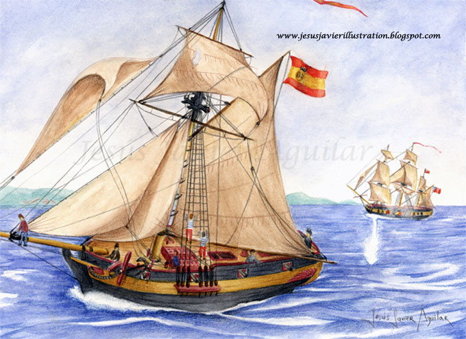 Dibujo a color de una balandra de guerra española en lucha con una fragata británica que intenta darle caza.