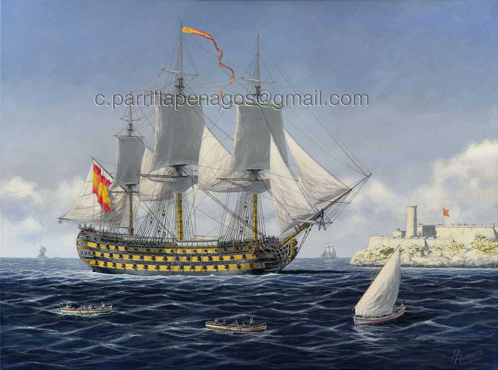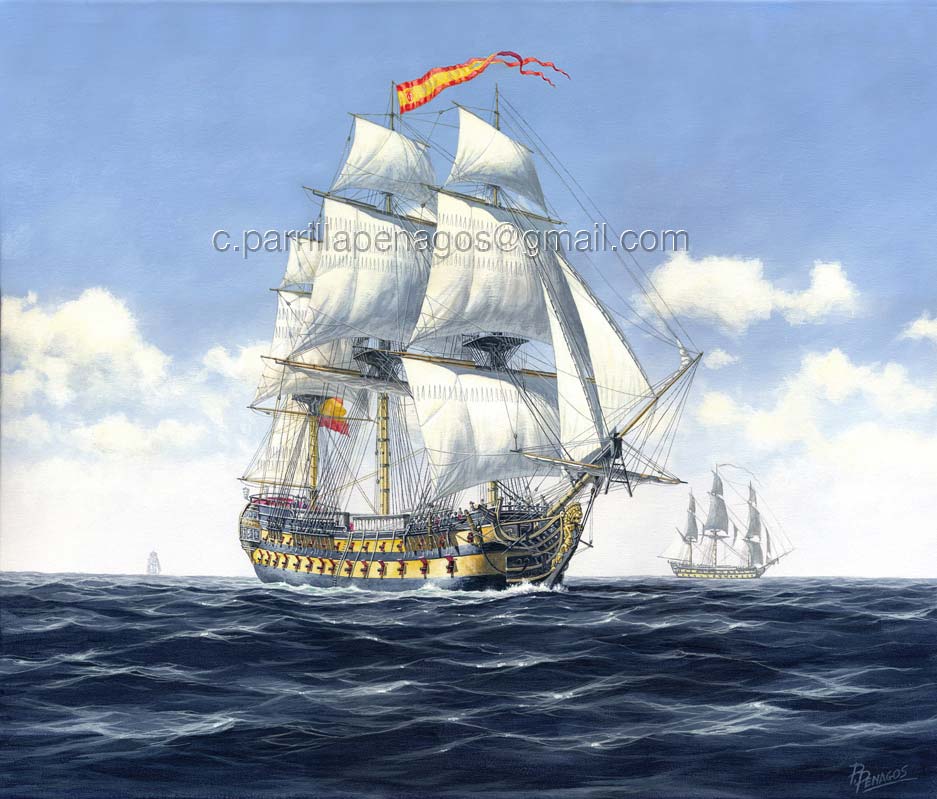 En la imagen aparece enarbolando un gallardetón en el tope del palo mayor, significando que un brigadier o un capitán de navío no subordinado lo comanda, quizá Churruca.