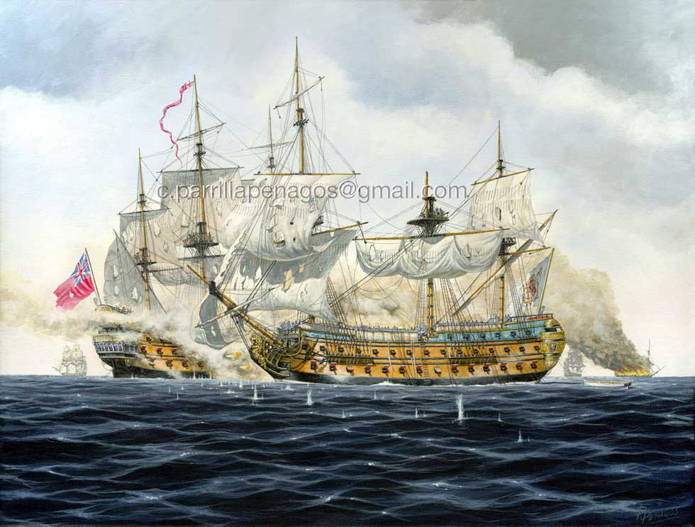Representación del último combate del navío "Glorioso". Vemos al navío español batiéndose con el Russell inglés de tres puentes y 92 cañones, al fondo a la derecha el Darmouth arde en llamas, mientras unas fragatas se mantienen apartadas de la acción después de haber recibido lo suyo.