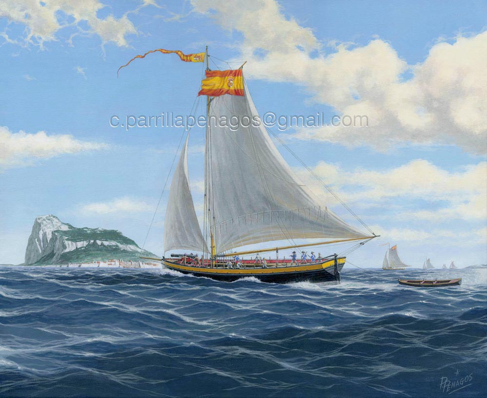 La pintura representa una división de estas unidades navegando por la bahía de Algeciras para acosar a las posibles embarcaciones que quisiesen entrar o salir de Gibraltar. Eran pequeñas pero matonas y los ingleses las sufrieron durante los últimos lustros del S.XVIII y primeros años del XIX, hasta que en 1808 la Guerra de la Independencia hiciera que los aliados y enemigos cambiaran de lugar.