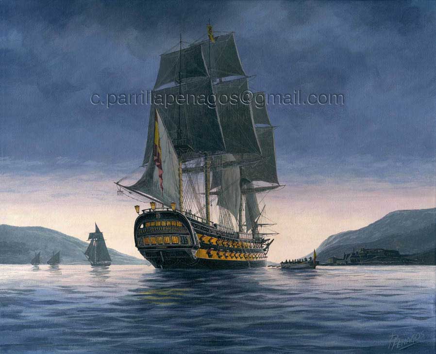 Navío de tercera clase y 74 cañones de encalmada en la ría de El Ferrol a las últimas luces del día. A la derecha vemos como una lancha se le acerca por su aleta de estribor, mientras al otro lado de la imagen unas embarcaciones se dirigen a puerto aprovechando el escaso viento antes de que caiga la noche. Al fondo, señalada por el bauprés del navío, se adivina la imponente silueta del castillos de San Felipe.