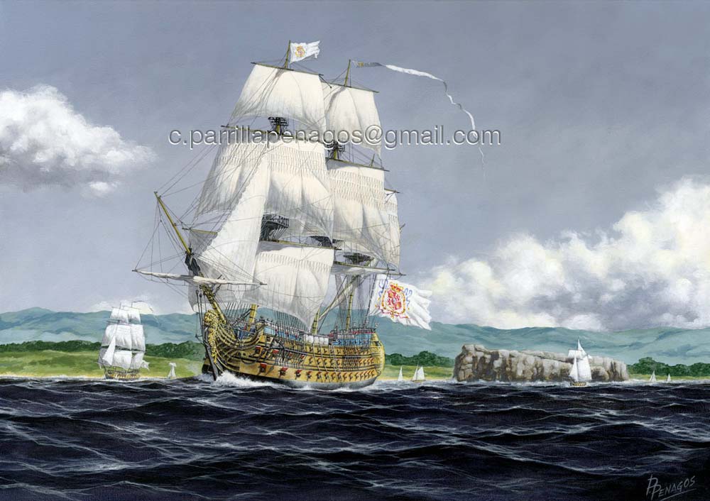 El Real Felipe recién artillado, con sus 114 cañones de buen hierro de La Cavada, dejando por la popa la bahía de Santander y la isla de Mouro. Navega con viento del nordeste que le entra por el costado de estribor. A la izquierda de la imagen una fragata le acompaña, a la derecha una balandra sigue sus aguas.